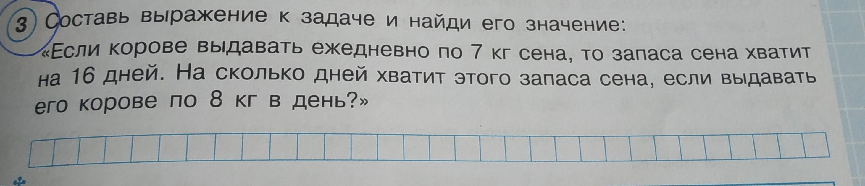 3 Составь выражение к задаче и найди его значение: Если корове выдавать ежедневно по 7 кг сена, то запаса сена хватит на 16 дней. На сколько дней хватит этого запаса сена, если выдавать его корове по 8 кг в день?»