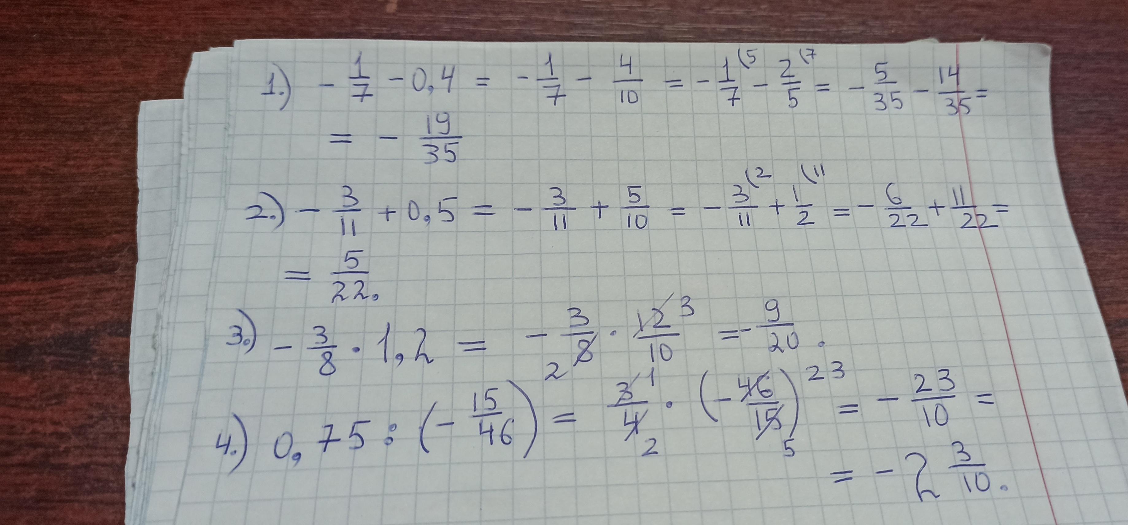 Совместные действия с дробями. 1) - 1/7 - 0,4; 2) - 3/11 + 0,5; 3) - 3/8 * 1,2; 4) 0,75 : ( - 15/46). помогите пж