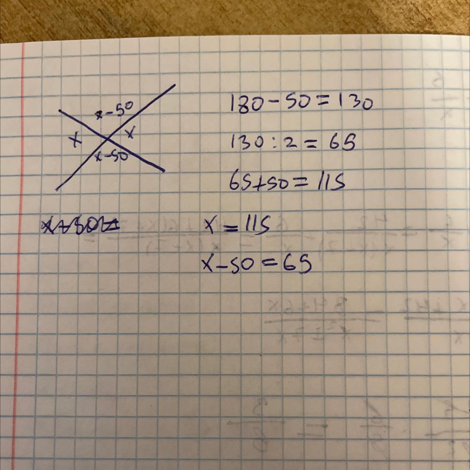 двух прямых, на 50° меньше другого. Найдите эти углы.