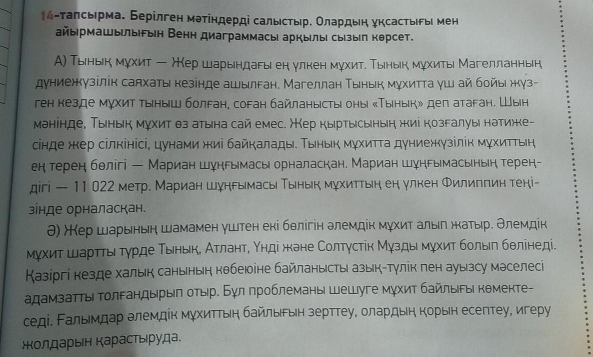 различие : Бірінші А) мәтінінде тек Тынық мұхиты жайлы жалпылама сипатталып айтылған. Ал Ә) Мәтінінде Әлемдік мұхиттардың шартты бөліктері жазылған. Ауызсу мәселесі жайлы ,оның шешу жолдарын ғалымдар қарастырып жатқаны айтылған.