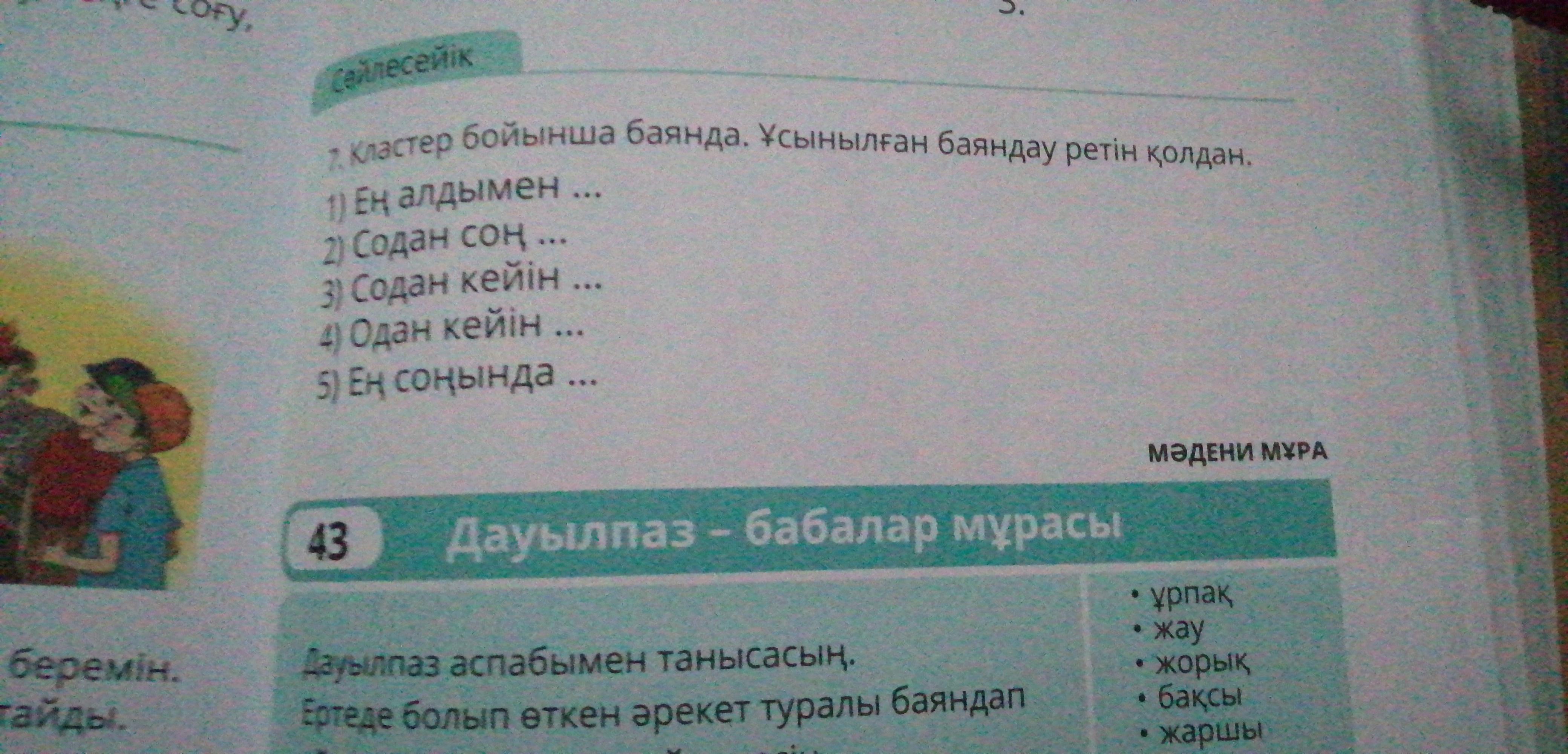 Кластер бойынша баянда. Ұсынылған баяндау ретін қолдан. 1)Ең алдымен... 2)Содан соң... 3)Содан кейін... 4)Одан кейін... 5)Ең соңында...