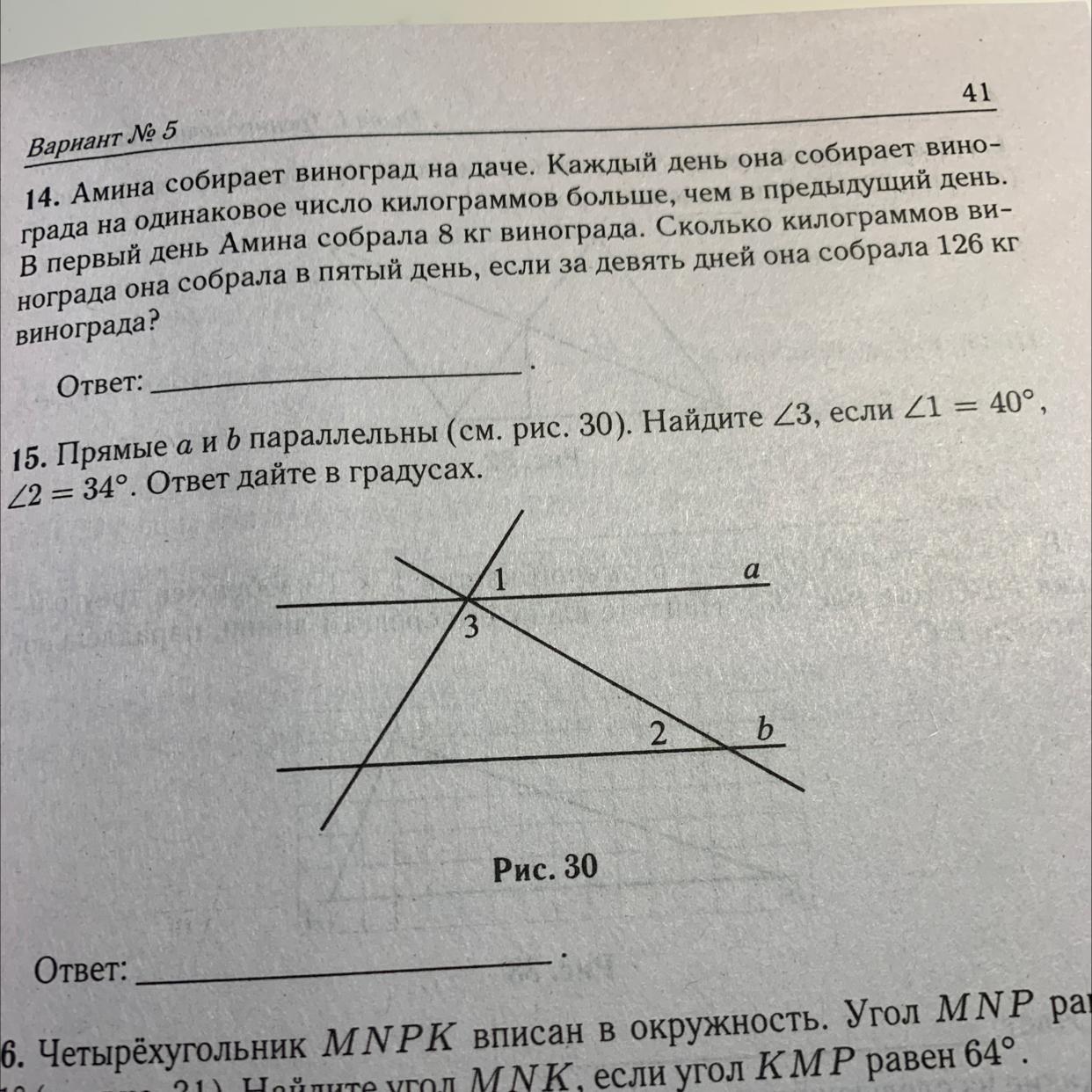 Прямые а и Б параллельны, найдите угол три если угол один равен 40°, угол два равен 34° ответ дайте в градусах
