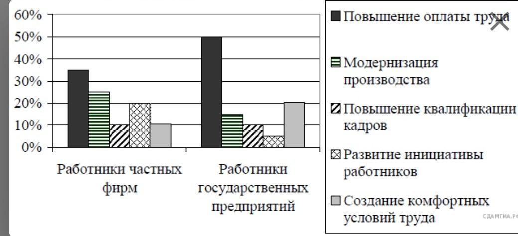 В стране Z был проведён опрос общественного мнения. Гражданам, участвующим в опросе, был задан вопрос: «Какой способ увеличения производительности труда Вы считаете наиболее эффективным?». Результаты опроса (в % от числа опрошенных) представлены в виде диаграммы.