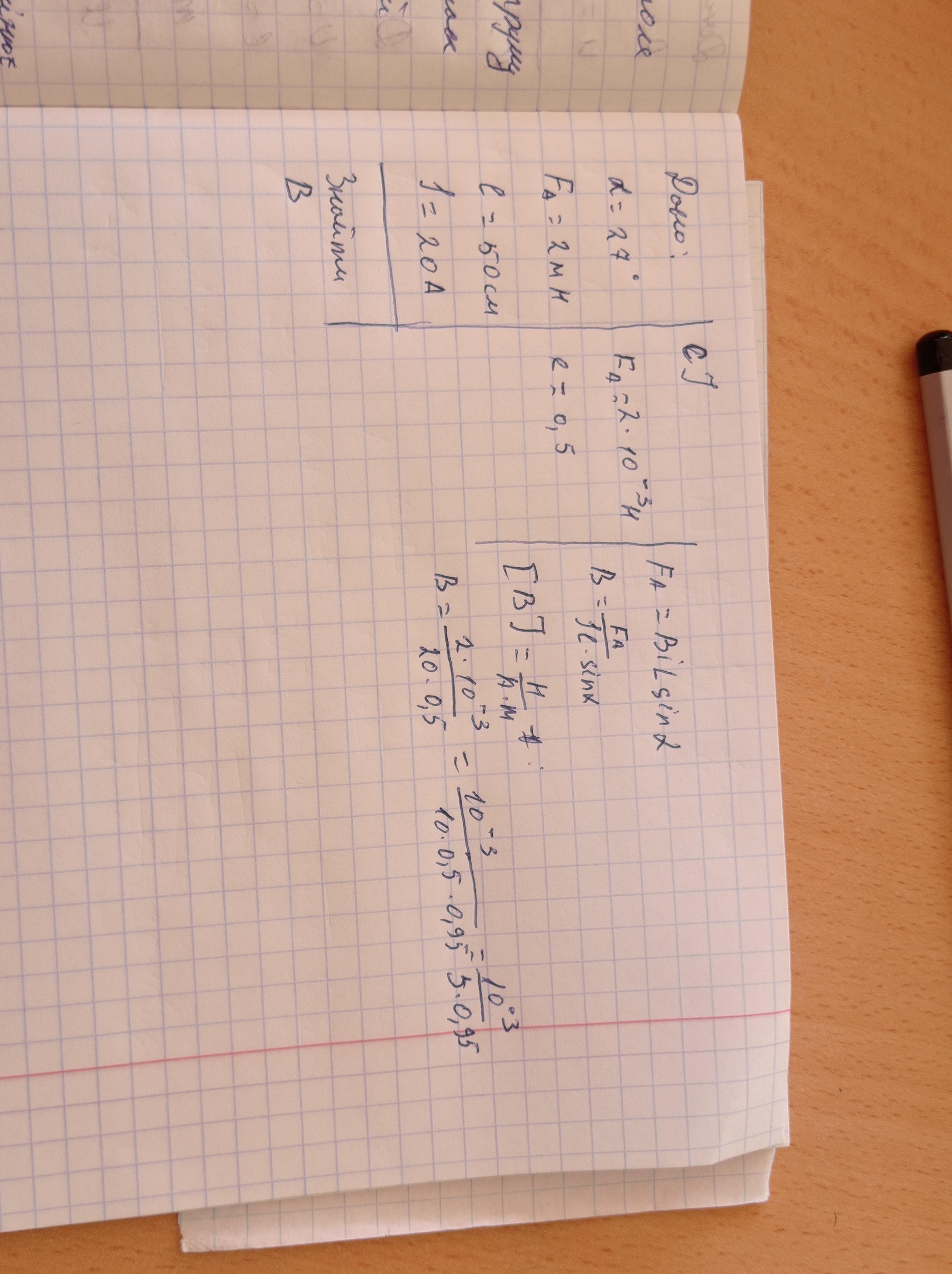 на прямий провідник зі струмом в однорідному магнітному полі вектор магнітної індукції якого утворює з провідником кут 27° діє сила 2*10^-3 визначити модуль вектора магнітної індукції якщо довжина провідника 50см а сила струму 20 А