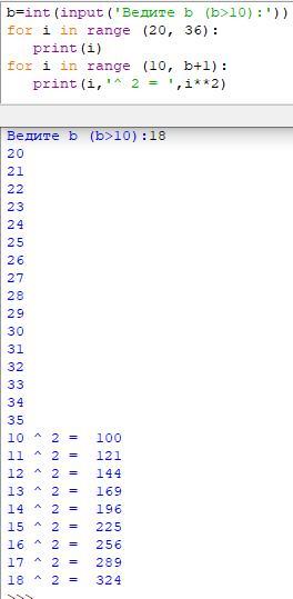 Написать программу которая выводит "столбиком": а) все целые числа от 20 до 35; б) квадраты всех целых чисел от 10 до b (значение b вводится с клавиатуры b>10);