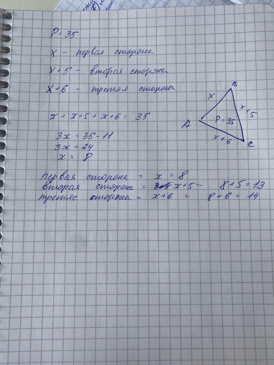 Периметр треугольника равен 35 см. Вторая сторона на 5 см длиннее первой, а третья сторона на 6 см длиннее первой. Найдите стороны треугольника. Сделайте рисунок к задаче. Решите способом уравнивания.