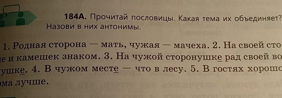 184A. Прочитай пословицы. Какая тема их объединяет? Назови в них антонимы. - 1. Родная сторона мать, чужая — мачеха. 2. На своей сто- роне и камешек знаком. 3. На чужой сторонушке рад своей во- ронушке. 4. В чужом месте — что в лесу. 5. В гостях хорошо, а дома лучше. -