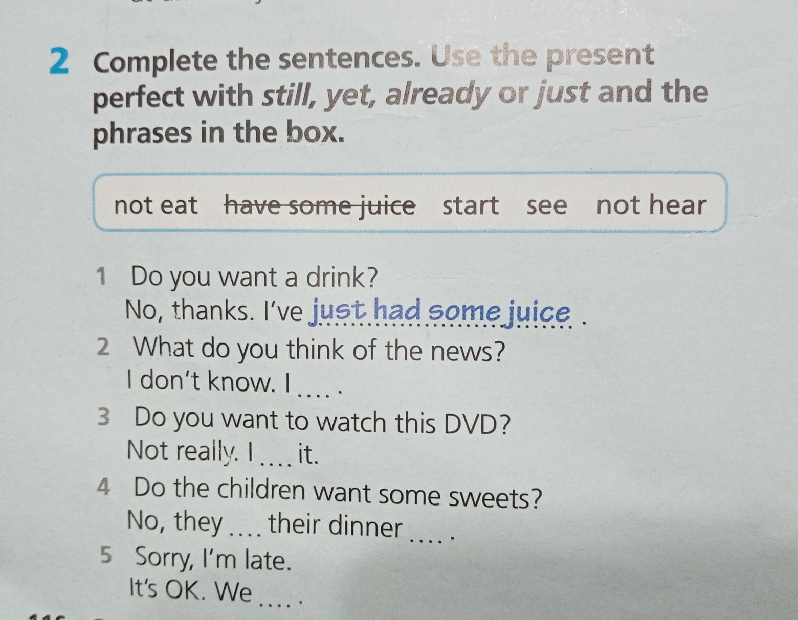 Complete the sentences. Use the present perfect with still, yet, already or just and the phrases in the box.