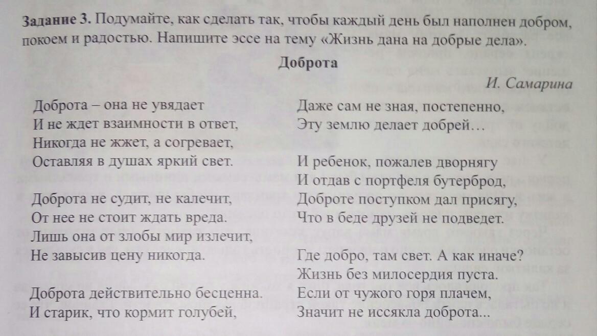Задание 3. Подумайте, как сделать так, чтобы каждый день был наполнен добром, покоем и радостью. Напишите эссе на тему «Жизнь дана на добрые дела».