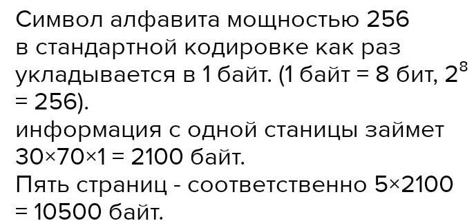 Для записи текста использовался 256 -символьный алфавит. Каждая страница содержит 30 строк по 70 символов в строке. Какой объем информации содержат 5 страниц текста?