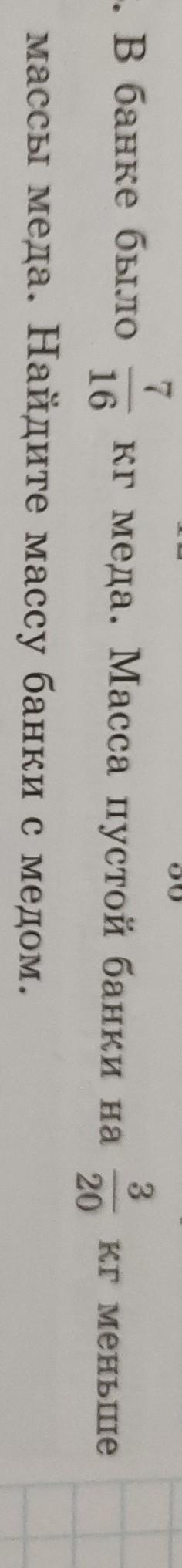 Ответ: нужно сложить массу мёда с массой пустой банки т.е равно 7/16+3/20=70+80/160=150/160 и можно сократить на 10: 15/16