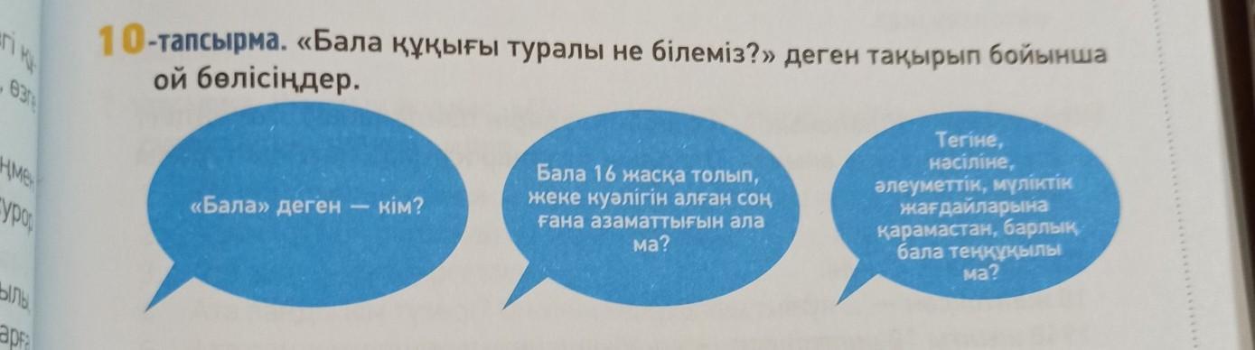 10-тапсырма. «Бала құқығы туралы не білеміз?» деген тақырып бойынша ой бөлісіңдер. Аме ру «Бала» деген - кім? Бала 16 жасқа толып, жеке куәлігін алған соң Гана азаматтығын ала Terine, исіліне, олеуметтік, мүліктік жағдайларына Карамастан, барлык бала тени мыло и? ма?
