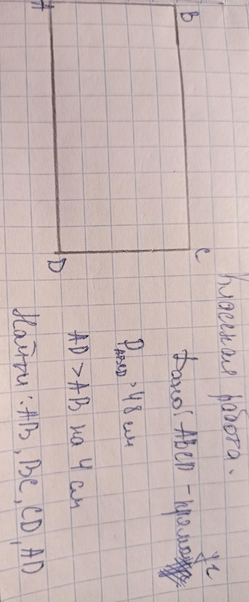 Обозначим АВ за Х, соответственно АD равен Х+4. Так как противоположные стороны прямоугольника равны, то получается СD = X, а ВС равен Х+4.