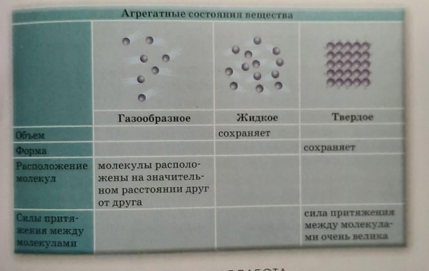 жидкое: не сохраняет, молекулы расположены на не значительном расстоянии друг от друга, сила притяжения между молекулами средняя