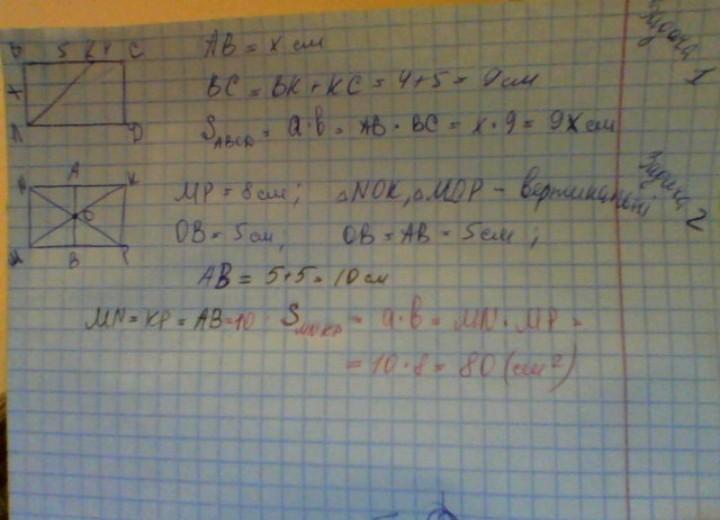 Биссектриса угла А прямоугольника ABCD разбивает сторону ВС на отрезки, равные 4 и 5 см. Найдите площадь прямоугольника.