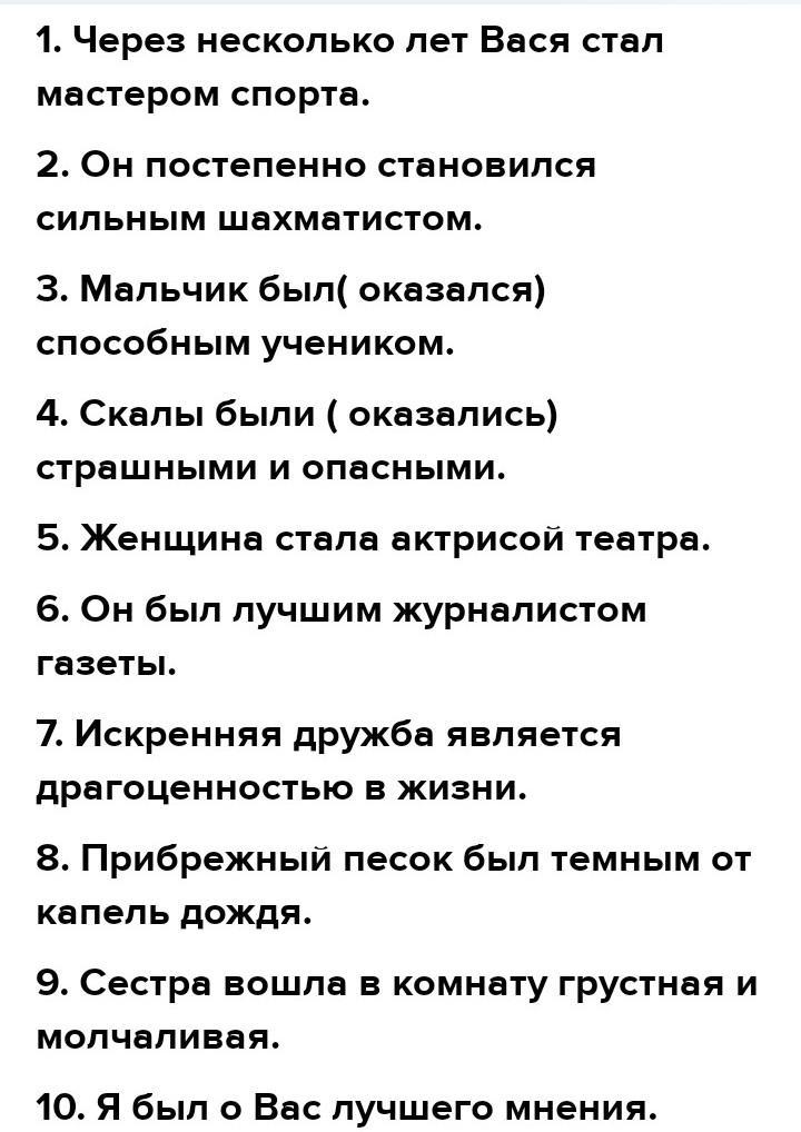 1. Через несколько лет Вася ... мастером спорта 2. Он постепенно ... сильным шахматистом. 3. Мальчик ... способным учеником. 4. Скалы ... страшными и опасными. 5. Женщина ... актрисой театра. 6. Он ... лучшим журналистом газеты. 7.Искренняя дружба ... драгоценностю в жизни.8. Прибрежный песок ... тёмным от капель дождя 9. Сестра... в комнату грустная и молчаливая. 10. Я ... о вас лучшего мнения.