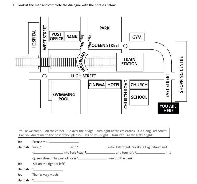 Hannah: Sure. Go along East Street and turn left into High Street. Go along High Street and turn right at the crossroads into Park Road. Go over the bridge and turn left at the traffic lights into Queen Street. The post office is on the corner, next to the bank.