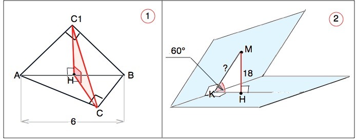 Дан двугранный угол который равен 60 градусов, точка M лежащая в одной из его граней удалена на 18 см от другой. Найдите расстояние от точки M до ребра двугранного угла.
