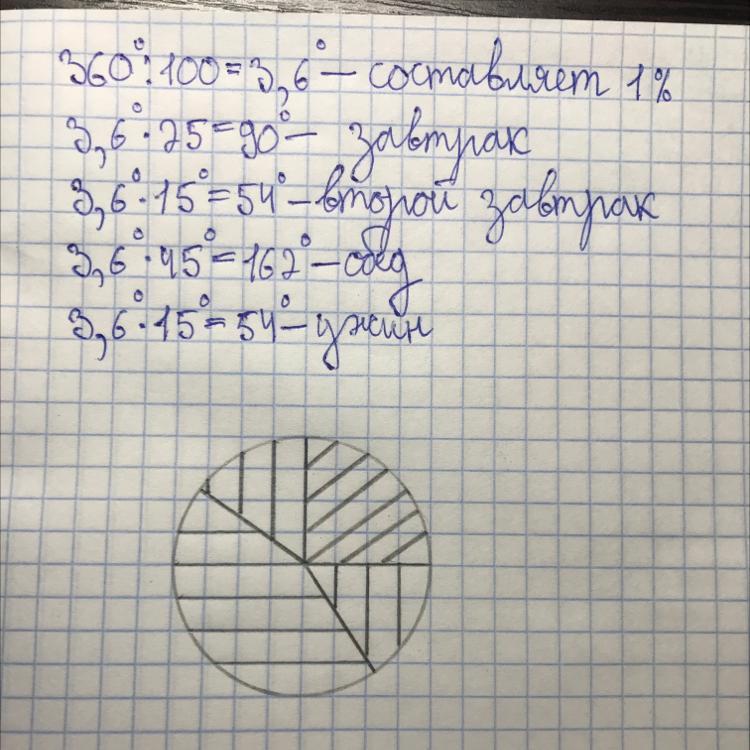 завтрак–25 %, второй завтрак – 15%, обед –45%, и ужин – 15%. Постойте круговую диаграмму