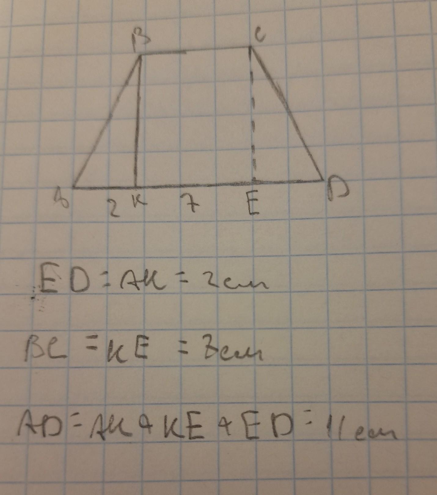 Висота рівнобічної трапеції, проведена з вершини тупого кута, ділить більшу основу трапеції на відрізки 2 см і 7 см. Знайдіть основи трапеції.
