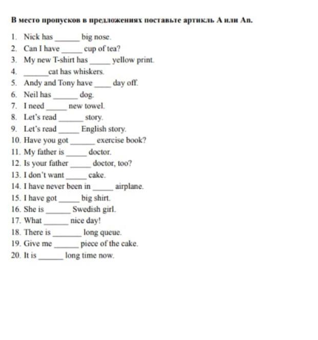 “A” мы употребляем перед существительным в единственном числе, которое начинается с согласной, например: a boy; a car; a bike; a dog. “An” употребляется с существительными в единственном числе, начинающимися с гласной, например: an elephant; an egg; an apple