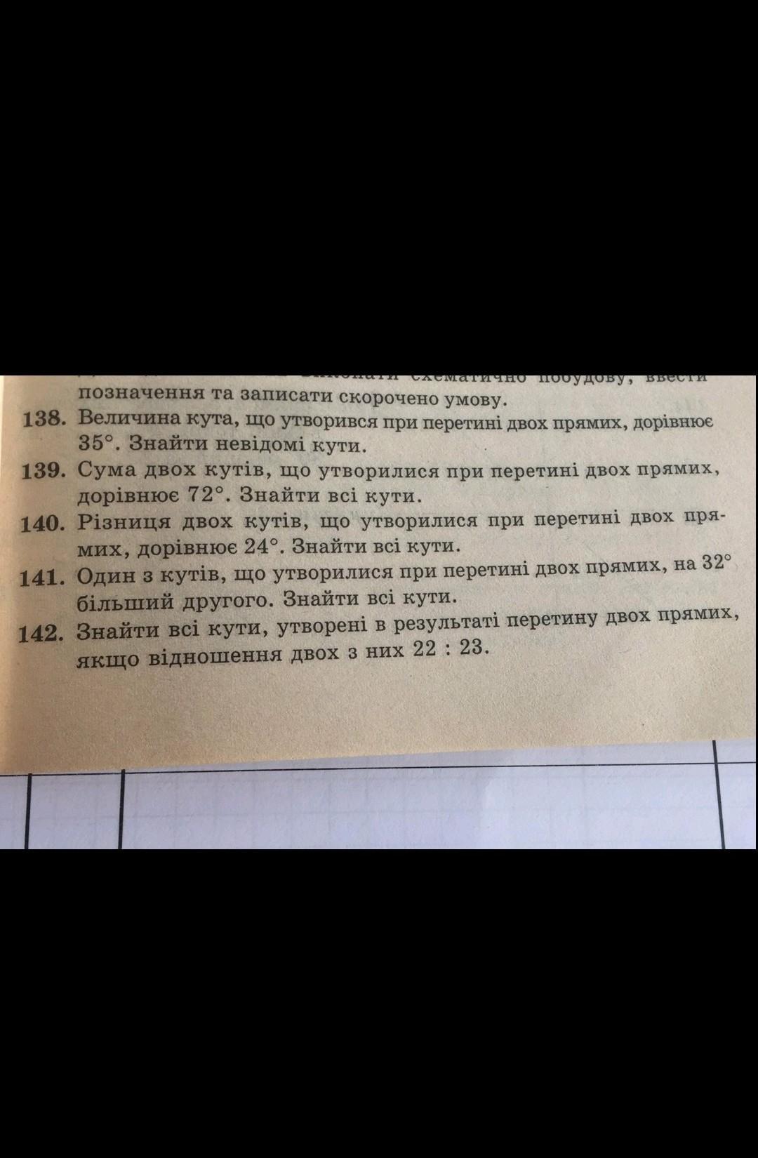 139)Так як при перетині двох прямих, кути вертикальні і суміжні , то один кут дорівнює 72° : 2 = 36° ,а другий кут 180° - 36° = 144 °