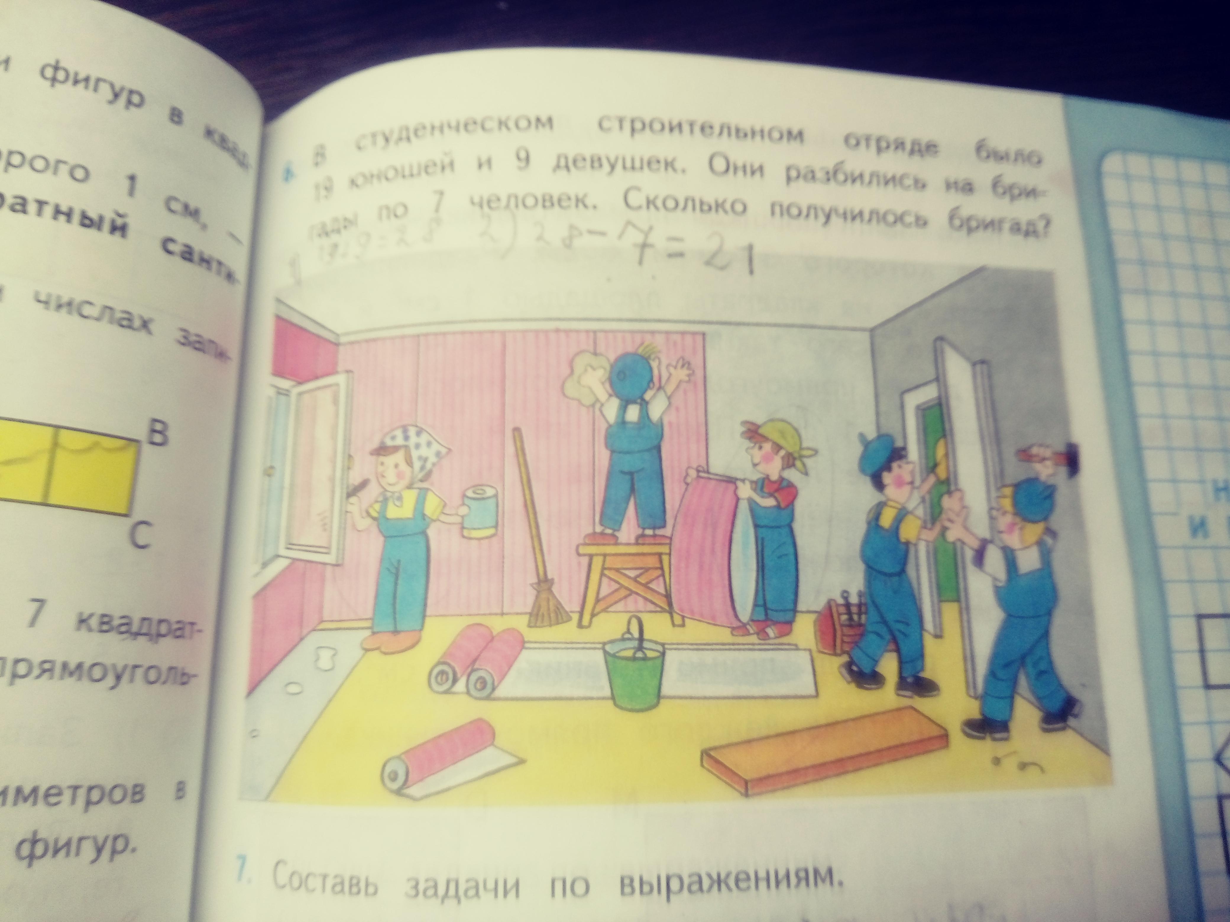 28/7=4 - делим общее количество человек в отряде на количество человек в бригаде