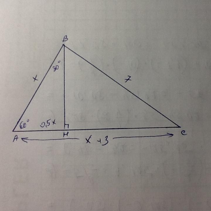 По т. косинусов 7²=х²+(х+3)²-2*х*(х+3)*cos60°,