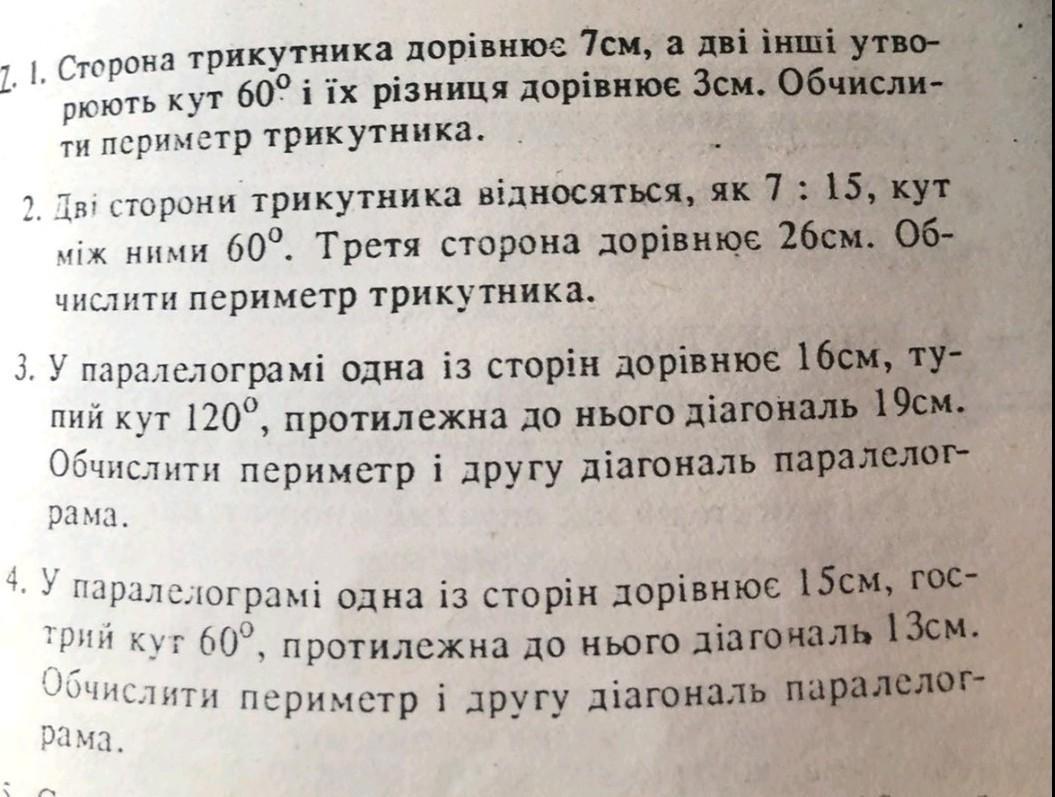 Сторона трикутника дорівнює 7см, а двi iншi утво рюють кут 60º і їх різниця дорівнює 3см. Обчислити периметр трикутника.