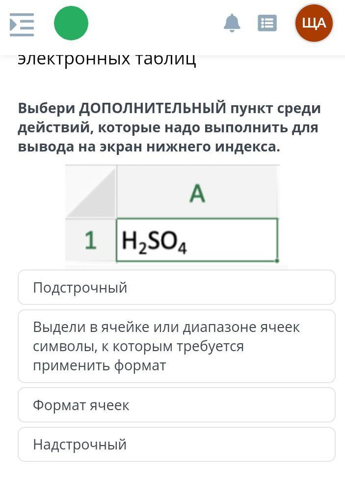 выбери ДОПОЛНИТЕЛЬНЫЙ пункт среди действий которые надо выполнить для ввода на экран нижнего индекса. помогите пожалуйста прошу просто помогите даю 50 баллов идите в ж0пу