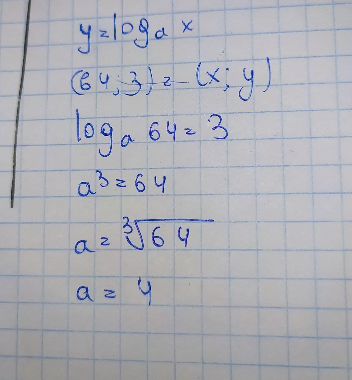 Объяснение: из определения логарифма, если функция принимает значение заданные точкой (64;3), основанием логарифма является 4