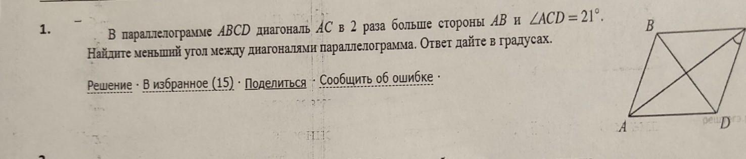 В параллелограмме ABCD диагональ АС в 2 раза больше стороны AB и ZACD = 21° Найдите меньший угол между диагоналями параллелограмма. Ответ дайте в градусах