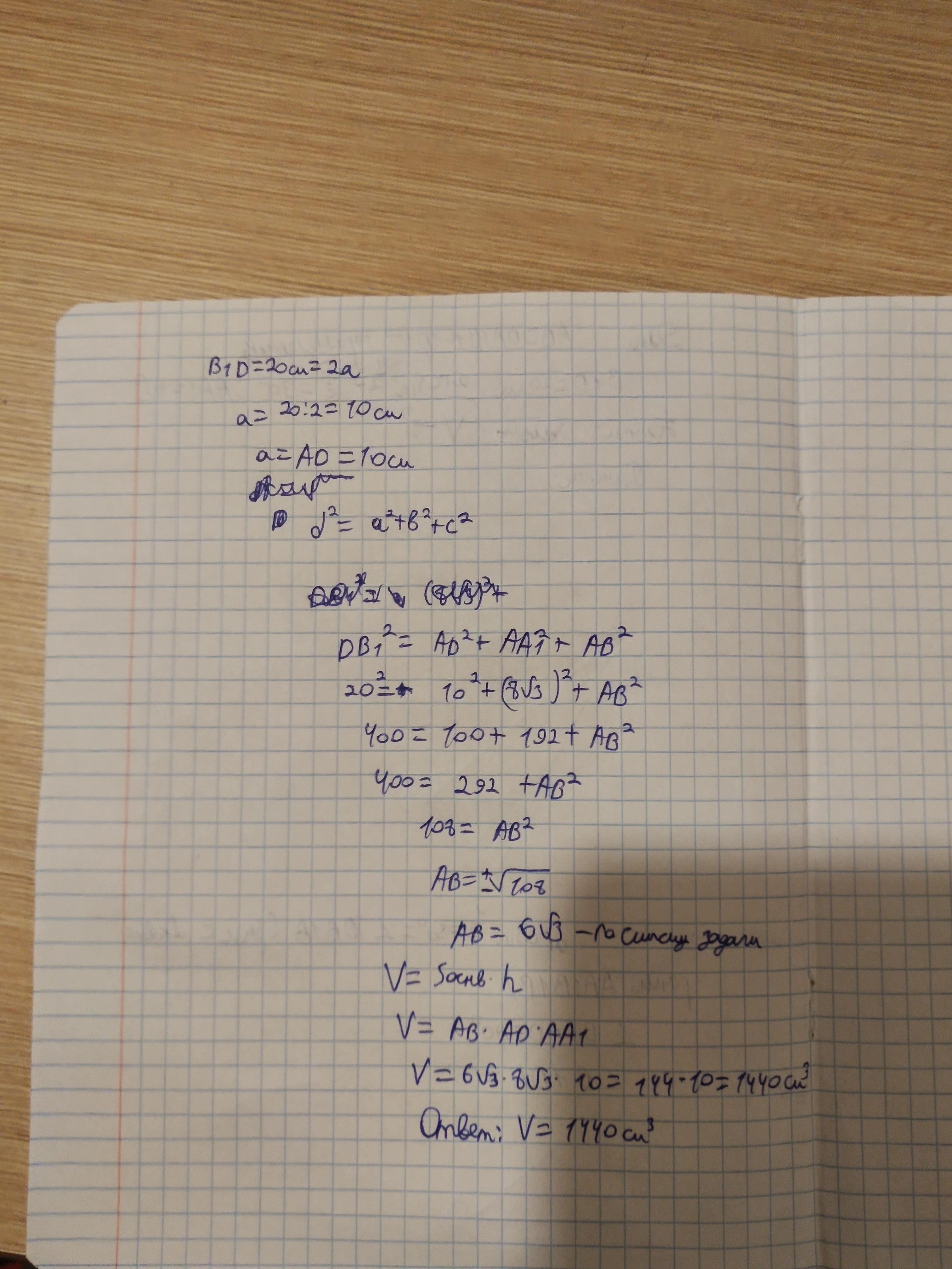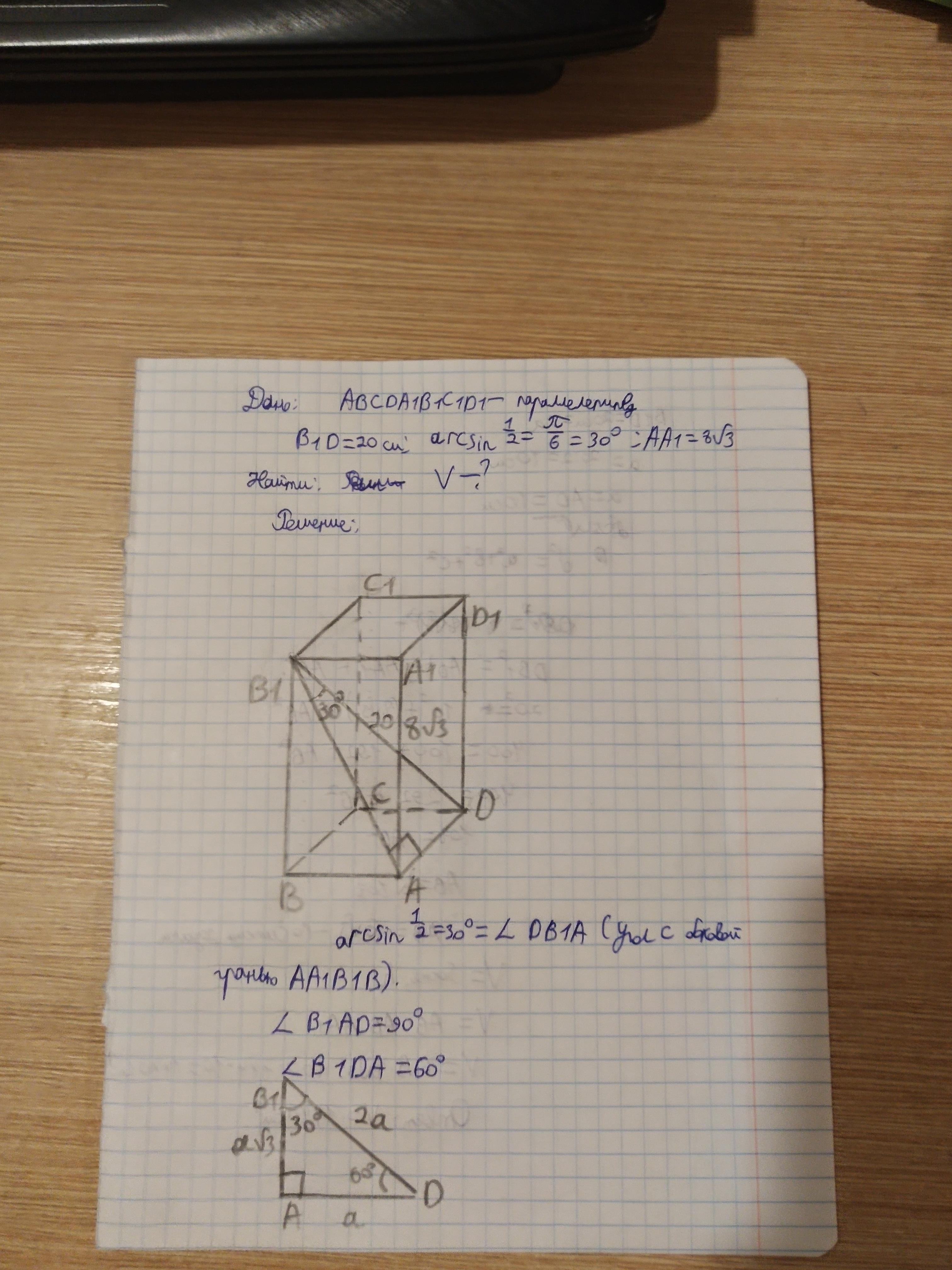 дан прямоугольный параллелепипед abcda1b1c1d1. диагональ bd1 равна 20 и составляет с боковой гранью aa1b1b угол arcsin корень из 1/2. aa1= 8√3 см. найдите объем прризмы