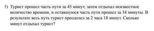 5) Турист прошел часть пути за 45 минут, затем отдыхал неизвестное количество времени, и оставшуюся часть пути прошел за 34 минуты. В результате весь путь турист преодолел за 2 часа 18 минут. Сколько минут отдыхал турист?