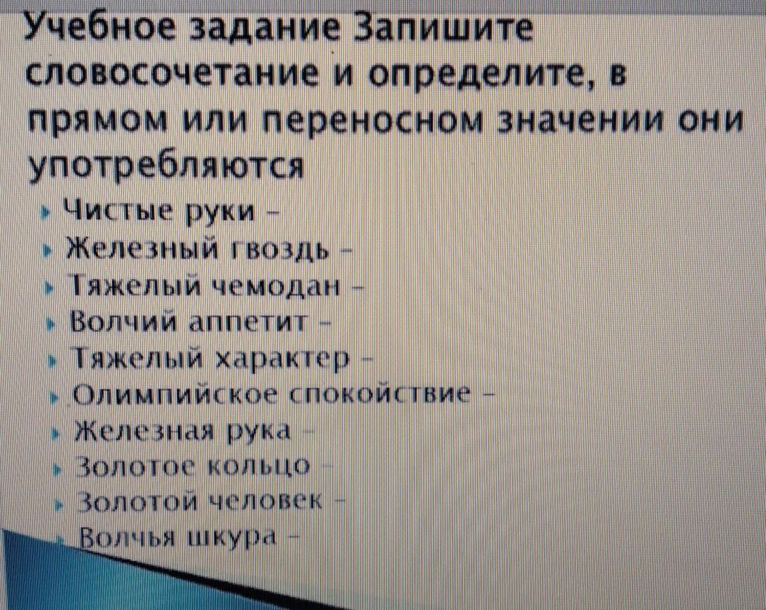 Учебное задание Запишите словосочетание и определите, в прямом или переносном значении они употребляются » Чистые руки - Железный ГВОЗДЬ » Тяжелый чемодан - Волчий аппетит » Тяжелый характер » Олимпийское спокойствие + Железная рука » Золотое кольцо - Золотой человек Волчья Шкура