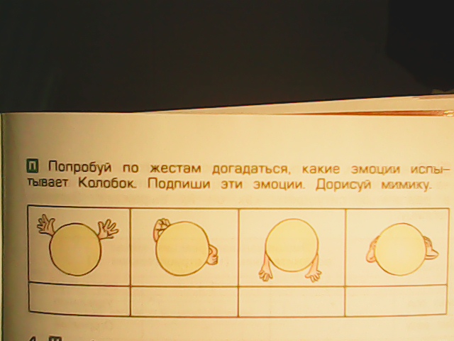 Попробуй по жестам догодаться, какие эмоции испытает Колобок. Подпиши эти эмоции. Дорисуй мимику.