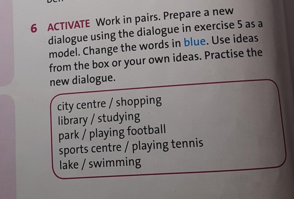 6 ACTIVATE Work in pairs. Prepare a new dialogue using the dialogue in exercise 5 as a model. Change the words in blue. Use ideas from the box or your own ideas. Practise the new dialogue. city centre / shopping library / studying park / playing football sports centre / playing tennis lake / swimming