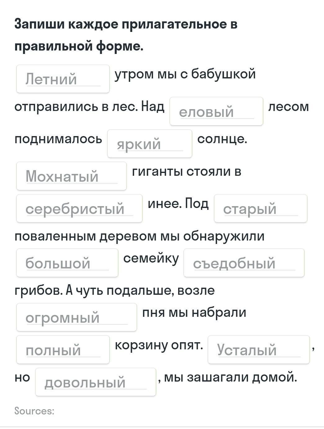 1.Летним 2.еловым 3.яркое 4.мохнатые 5.серебристом 6.старым 7.большую 8.съедобных 9.огромного 10.полную 11.усталые 12.довольные.