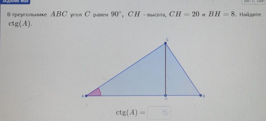 ° П В треугольнике ABC угол Сравен 90°, СН – высота, СН = 20 и BH = 8. Найдите ctg(А). с