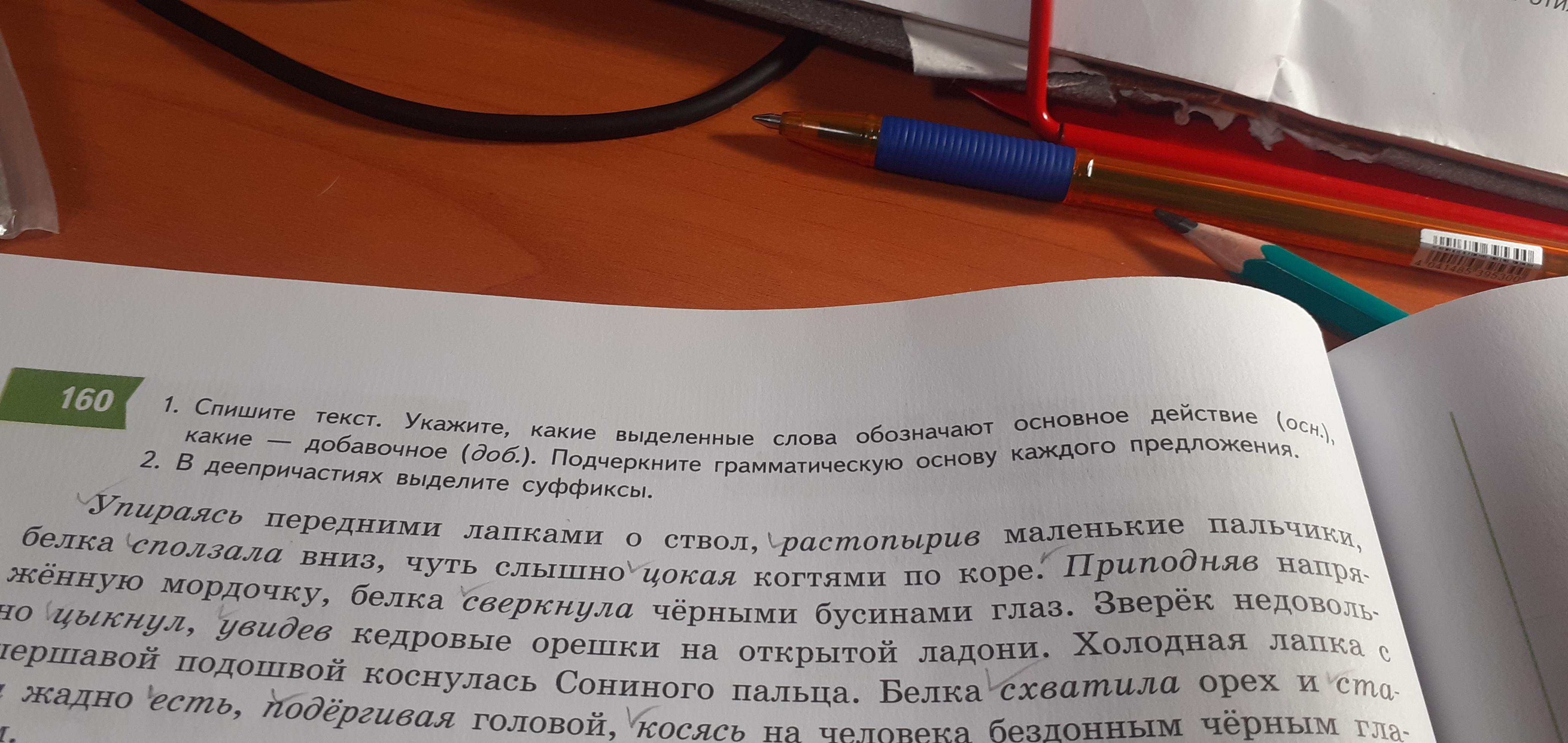 Упираясь (доб.) растопырив (доб.) сползла (осн.) цокая (доб.) приподняв (доб.) сверкнула (осн.) цыкнул (осн.) увидев (доб.) схватила (осн.) стала (осн.) есть (осн.) подёргивая (доб.) косясь (доб.)