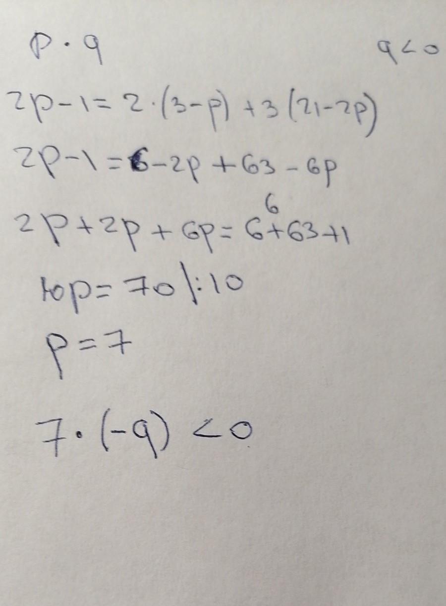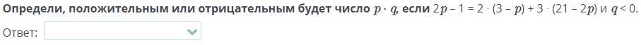 Определи, положительным или отрицательным будет число p ∙ q, если 2p – 1 = 2 ∙ (3 – p) + 3 ∙ (21 – 2p) и q < 0.