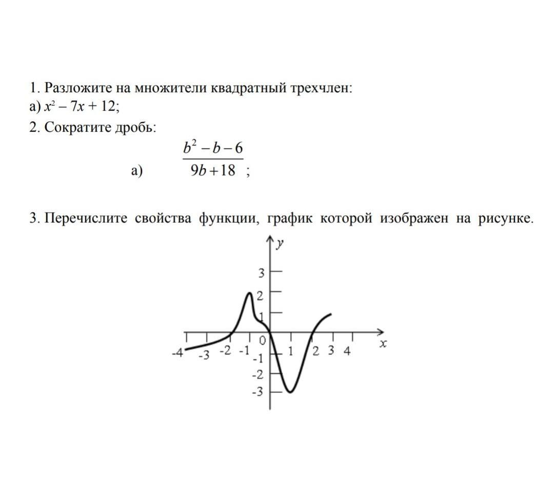 Разложить на множители квадратный трехчлен. Сократить дробь. Перечислите свойства функции, график который изображен на рисунке.