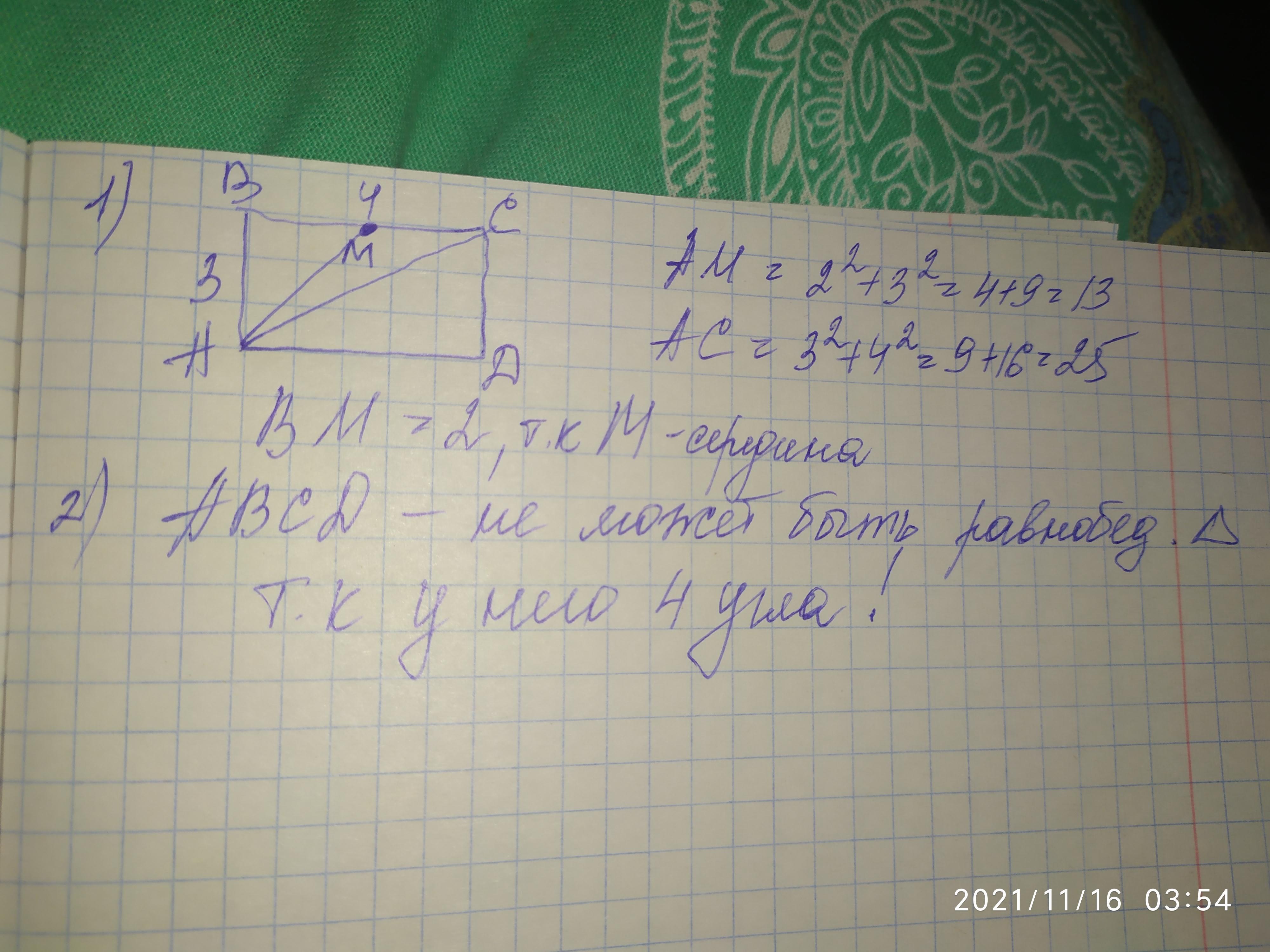 1) Прямоугольник АBCD. АВ=3 см,ВС=4 см. Точка М- середина ВС. Найти длины векторов векторов АМ и АС.