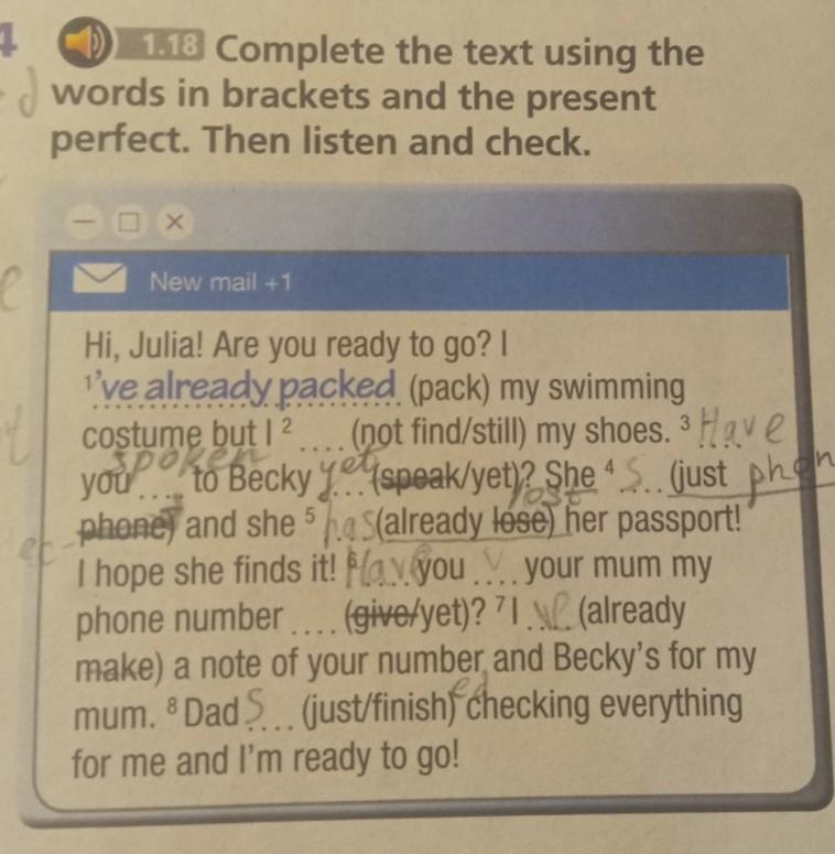I've already packed my swimming costume but i still haven't found my shoes. Have you spoken to becky yet? She has just phoned and she has already lost her passport! I hope she finds it! Have you gave your mum my phone number yet? I already made a note of your number and becky's for my mum. Dad has just finished checking everything for me and i'm ready to go!