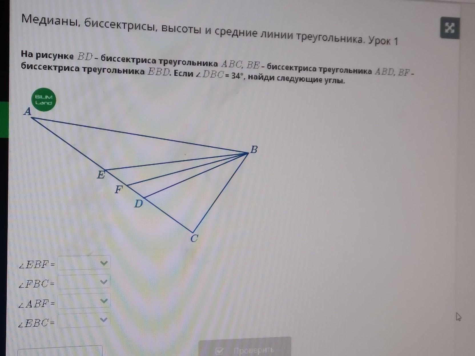 Медианы, биссектрисы, высоты и средние линии треугольника. Урок 1 На рисунке BD - биссектриса треугольника ABC, BE – биссектриса треугольника ABD, B биссектриса треугольника EBD. Если 2DBC = 34°, найди следующие углы. BILIM Lэгс А В E F D с LEBF= LFBO=