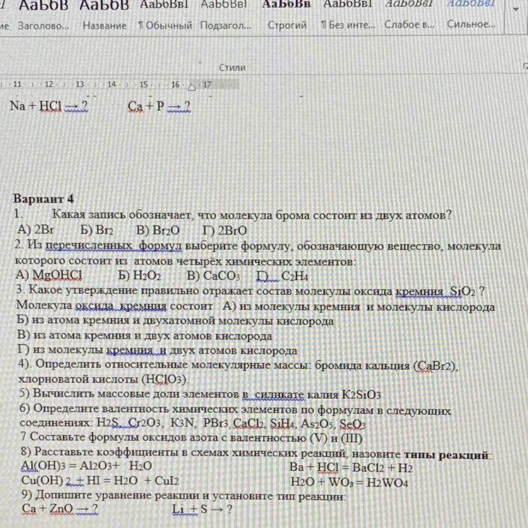 Ответ:1-A; 2-Б; 3-Г; 4-(CaBr2)=200;(Hclo3)=84; 5-k(2)-51%;Si-18%;0(3)-31%;