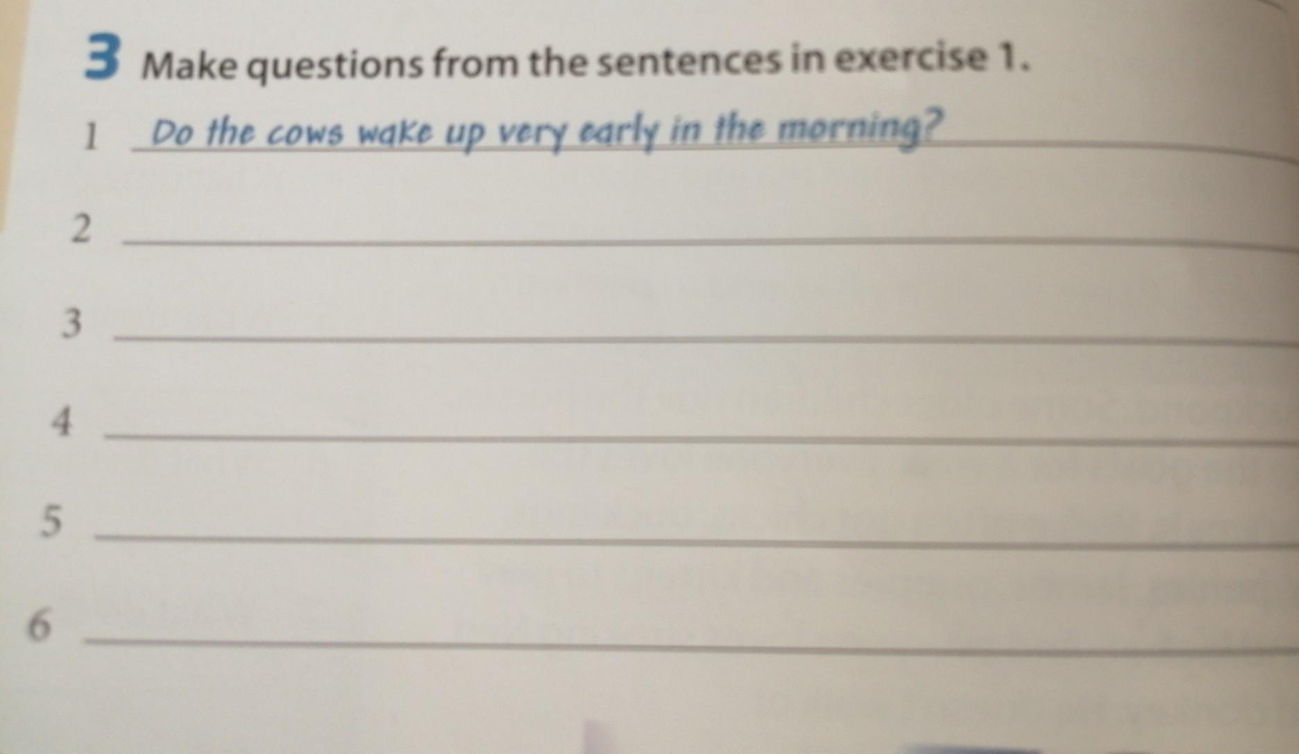 times. 1 сее 3 Make questions from the sentences in exercise 1. Do the cows wake up very early in the morning? r 1 2. 3 4 5 6 form
