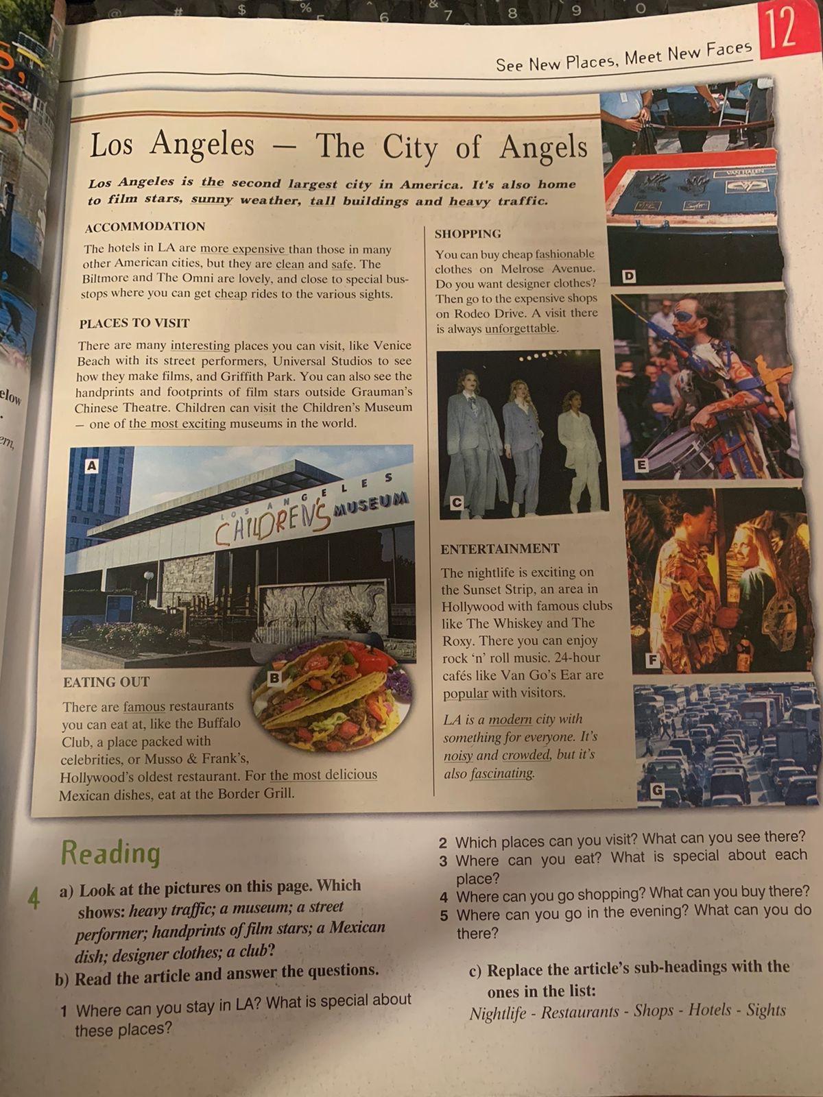 2) There are lots of places to visit, for example Venice Beach where you can find street performers or Universal studios where you can see how people make films.