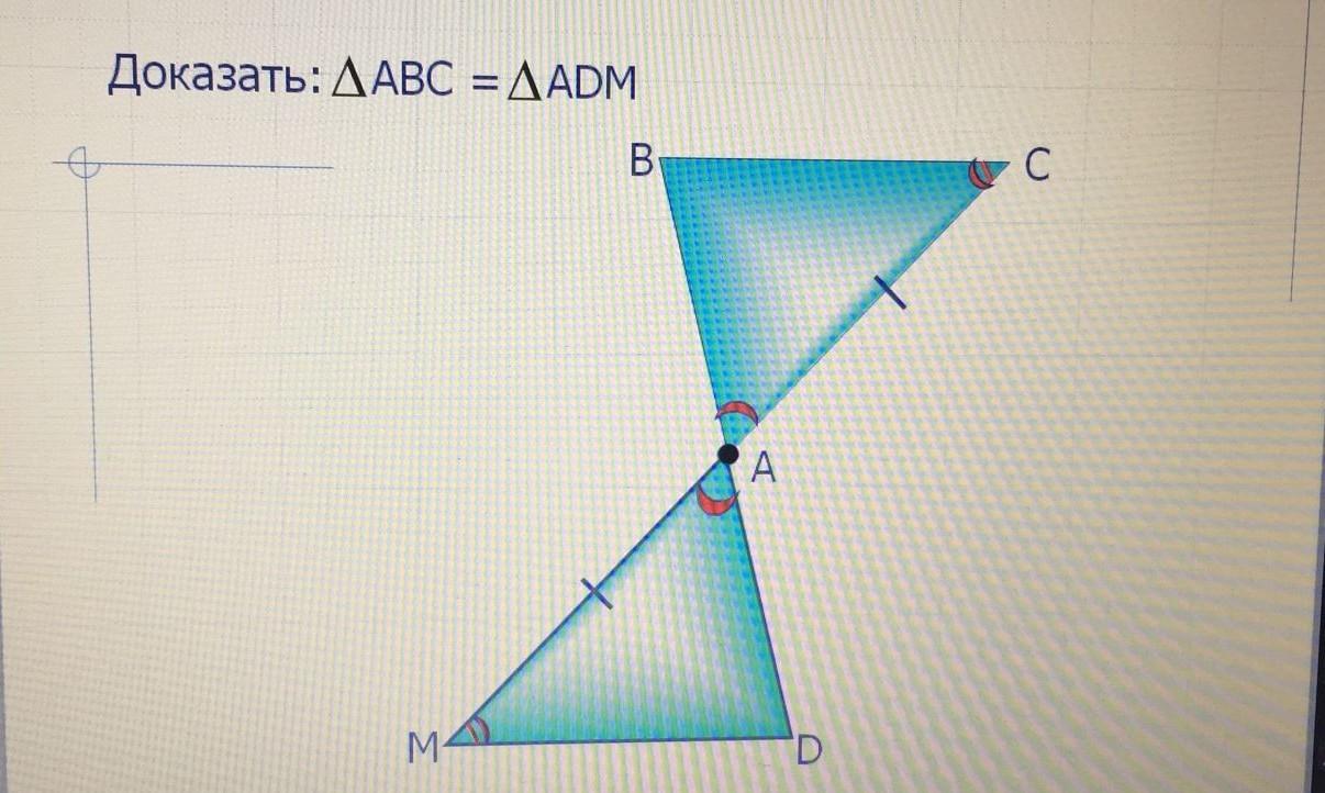 углы ВАС=АДМ, так как они вертикальные, АС=АM По условию, угол С=М так же по условию, из всего вышесказанного следует, что треугольник АВС=АМД по стороне и 2 прилежащим к ней углам