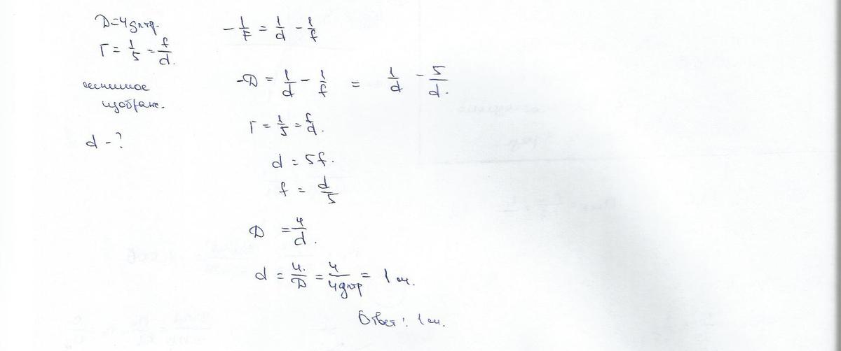 на каком расстоянии d от рассеивающей линзы с оптической силой D=4дптр надо поместить предметы, чтобы его мнимое изображение получилось в k=5 раз меньше самого предмета??